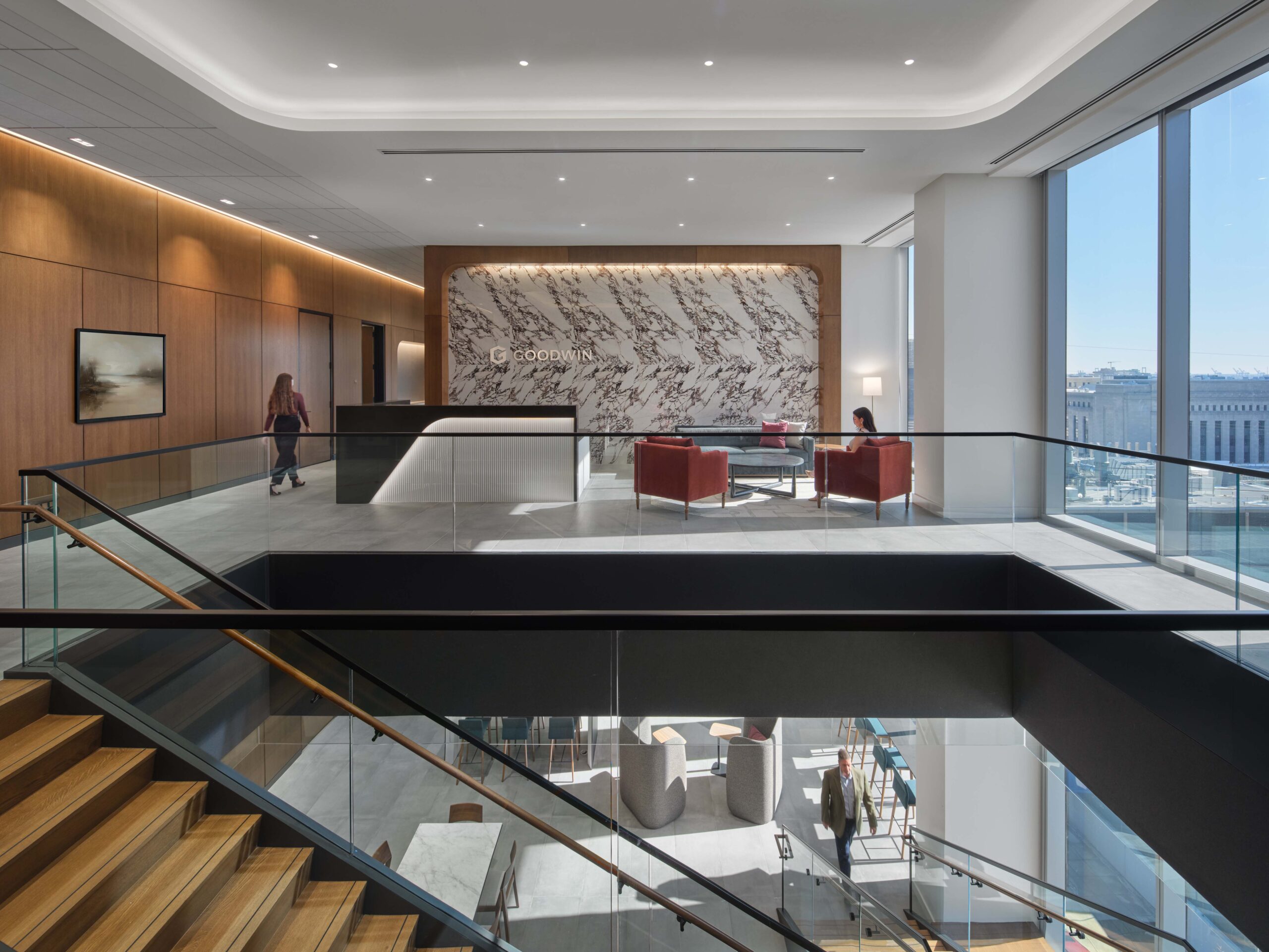 The highly functional and expanded conference center now includes a dedicated catering kitchen and a visitor office for clients needing private workspace. The reimagined café was strategically located to encourage interaction and connection. Reservable workstations provide greater flexibility, seamlessly blending hospitality and workplace design to elevate both employee and client experiences. We redefined what a law firm can be—for Goodwin, it prioritizes equality, hospitality, and connection.